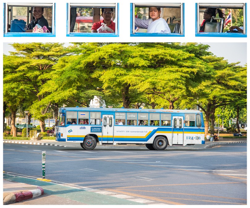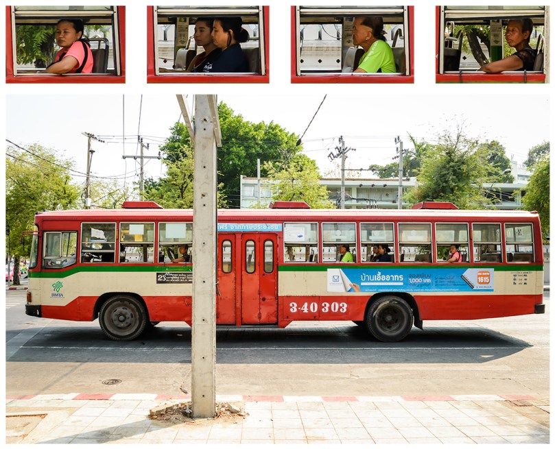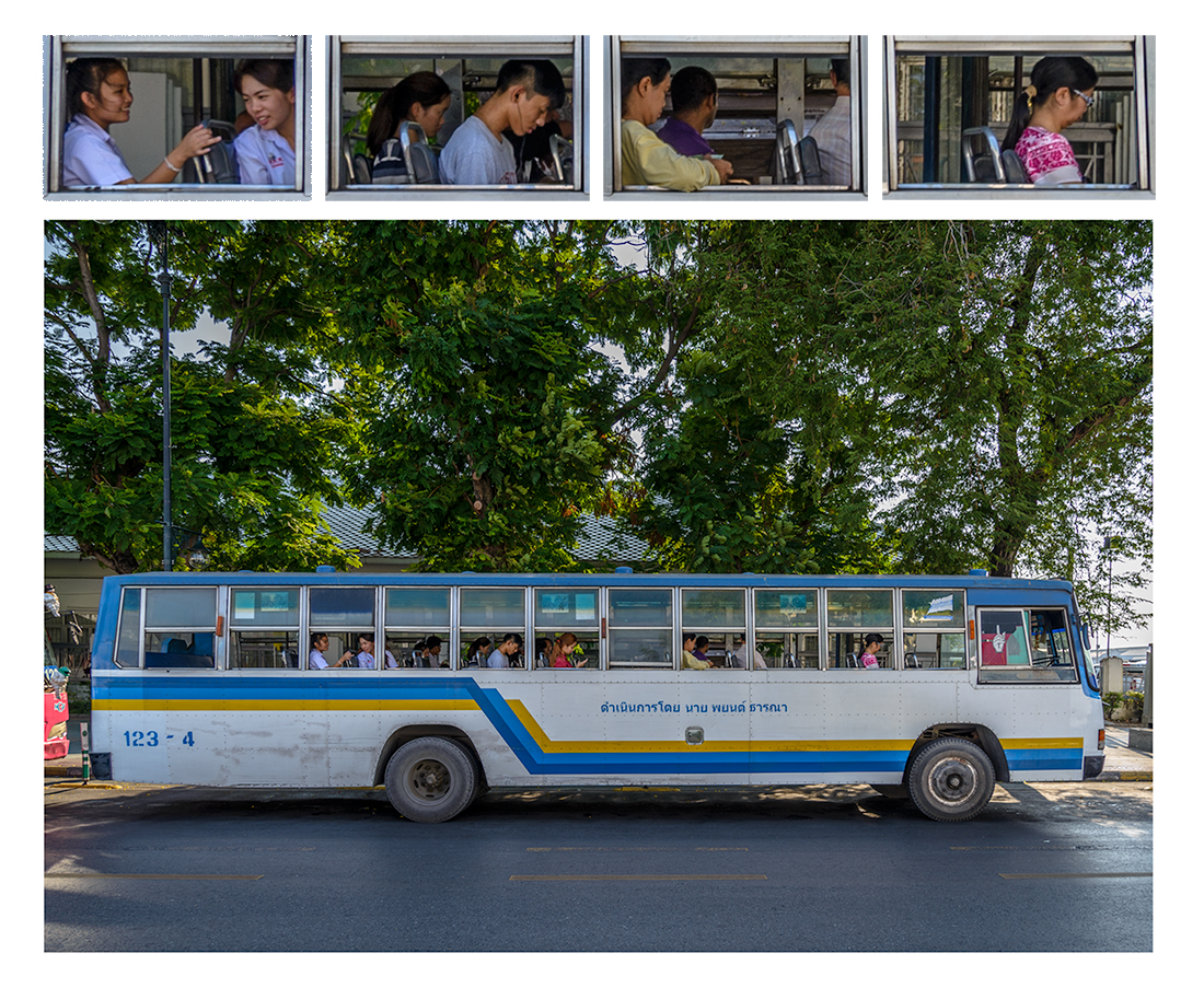 As I was walking around the Wat Pho area I saw one bus waiting. I noticed how the passengers were together, but still alone. As I looked on from outside I realised that people lose their self awareness when sitting on the bus. You could openly see people lost in their own world: talking to a friend, listening to music, daydreaming etc.