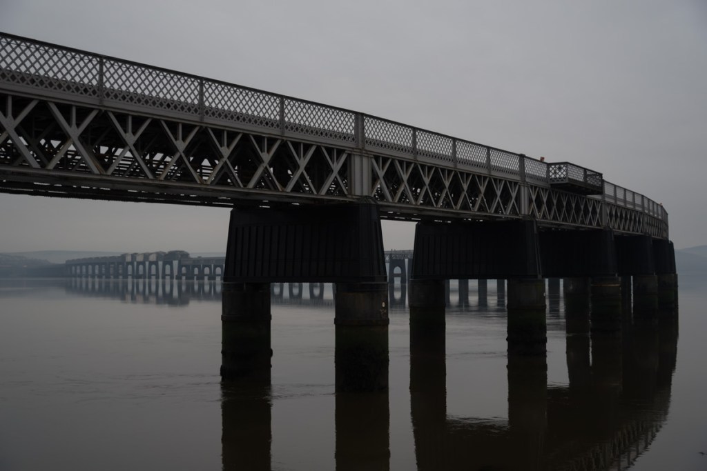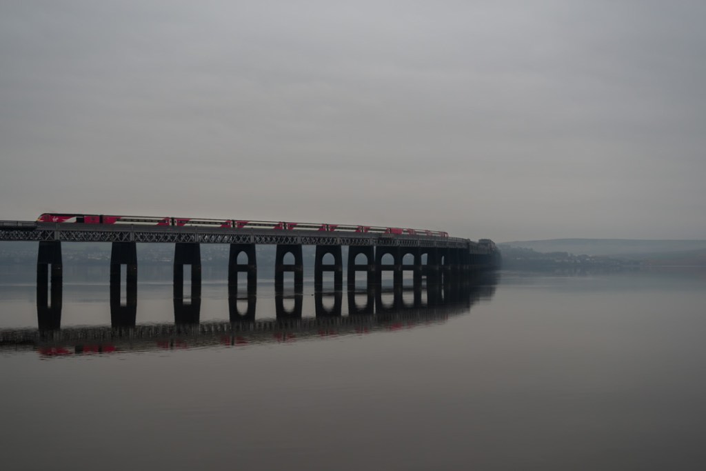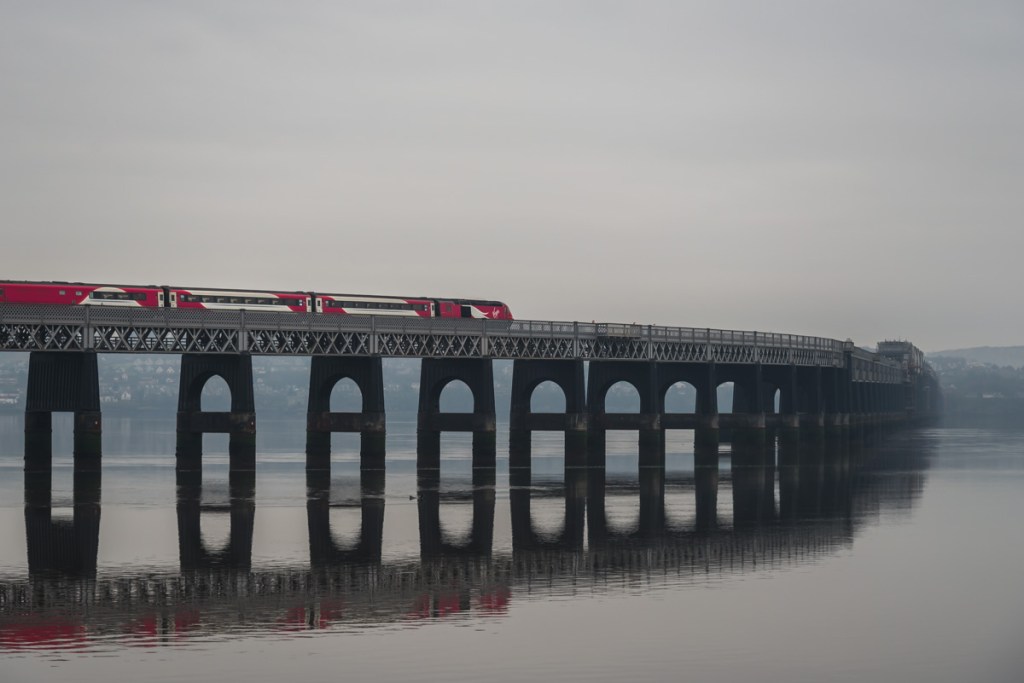 A virgin rail train crossing the bridge on a foggy day in Dundee in Scotland
