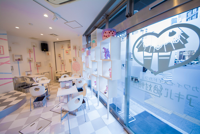 The cafe is decorated in bright, light colours and they have some nicely arranged shelves with cute toys and models.