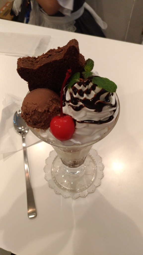 I got a warm welcome and one of the maid’s gave me a copy of the menu with English and Japanese. She recommended a set menu. I decided to have the desert option. It included a drink, chocolate sundae and a photograph with one of the maids.
